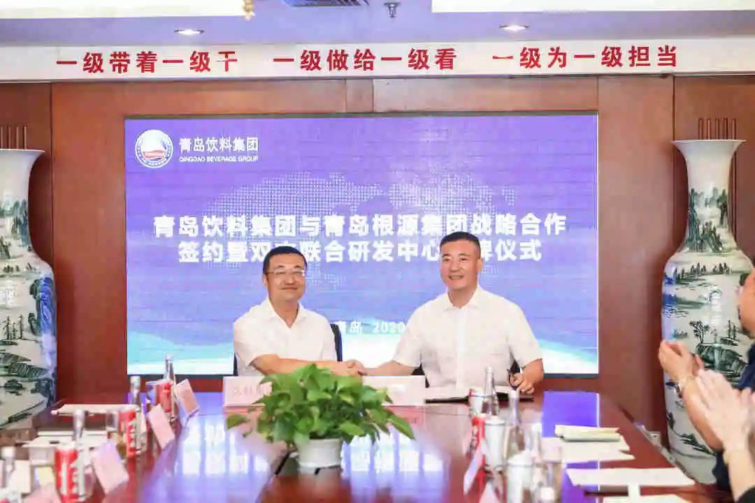 2020年8月14日上午,在东海西路15号青岛饮料集团总部2001会议室,根源集团与青岛饮料集团举行战略合作签约暨双方联合研发中心揭牌仪式。根源集团董事长张宗国,青岛饮料集团党委书记、董事长王达,以及双方有关负责人出席仪式。