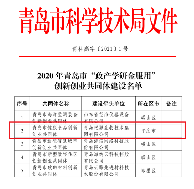 近期,青岛市科学技术局公布了2020年青岛市“政产学研金服用”创新创业共同体建设名单,根源集团获批“青岛市健康食品创新创业共同体”牵头单位。